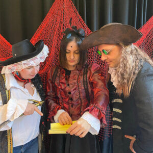 Para empezar nuestros game masters os introducirán en la historia explicándoos que os encontráis en una isla maldita que oculta un legendario tesoro. Cada uno de vosotros estáis ahí por diferentes motivos: algunos sois conquistadores en busca de nuevas tierras, otros seréis de la tribu local y otros unos piratas dispuestos a todo por encontrar el oro. ¡Entre vosotros estará el asesino del Capitán Flint!